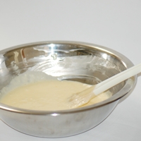 ■次に卵と砂糖を混ぜたボールに小麦粉と牛乳を少しずつ加えてよく混ぜ合わせる。